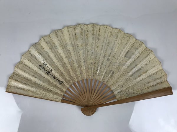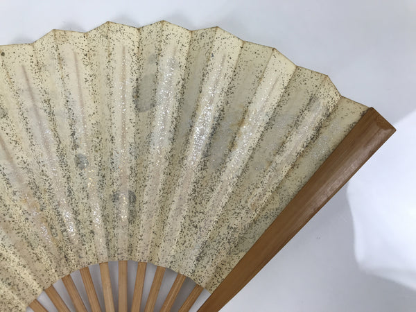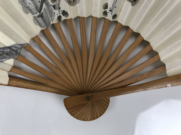 This is a traditional Japanese folding fan called sensu. You can use this when it's hot or as decoration. This decorative fan represents a plum tree with blossoms and buds, painted in gold, gray and black. The piece is signed with a name and a red seal. There are inscriptions on the back. The inner frame is natural bamboo.