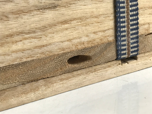 This (almost) cube-shaped lidded box is made of wood and has a natural wood color. It is likely handmade. There is a paper label on the front of the box and strings to secure the lid. It is excellent for general storage, DIY, or decoration.