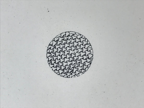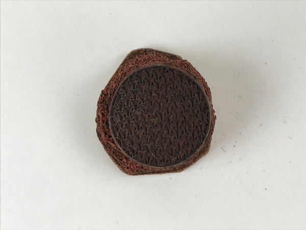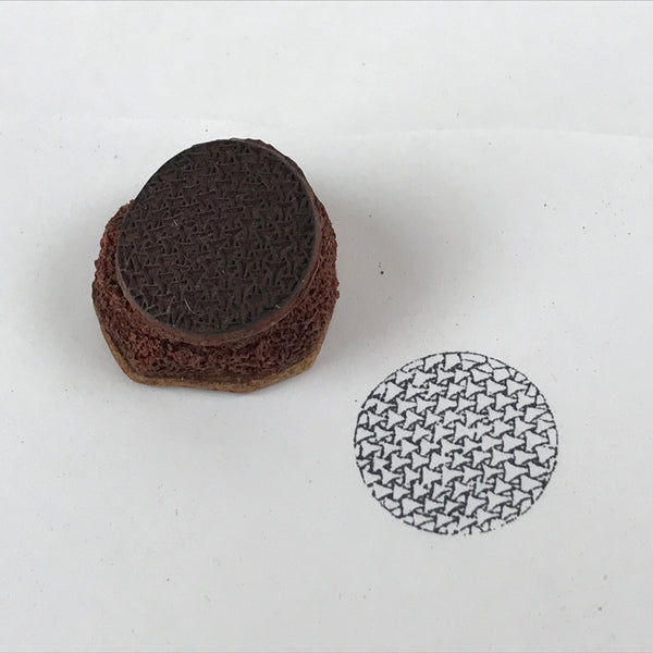 This is a Japanese vintage rubber stamp attached to a sponge-like base. The stamp features a geometric pattern of entangled triangles enclosed in a circle. The sponge base has hardened. This stamp can be used as it or you can remove the rubber to place it on another base.