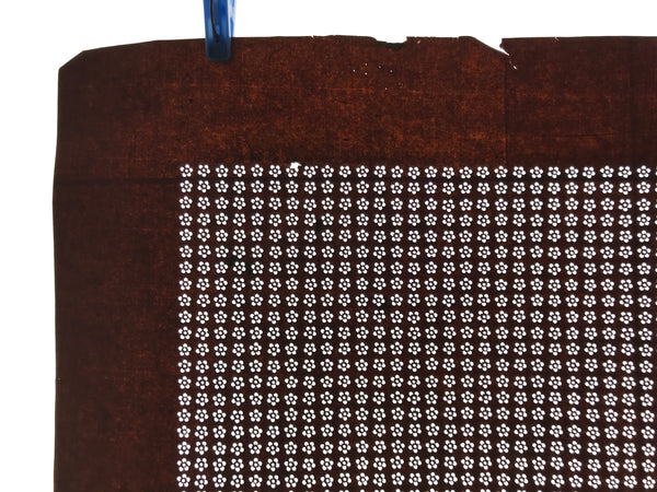 This antique Katagami was designed during the mid or late Edo period (1860) to early Meiji (1900) in Central Japan. It is made of two or more layers of handmade mulberry paper laminated together and waterproofed with persimmon tannin. Katagami printing uses a technique called resist dye where a paste is applied to the fabric with the katagami before dipping in ink. The open space on the katagami will be a negative space in the printed design.