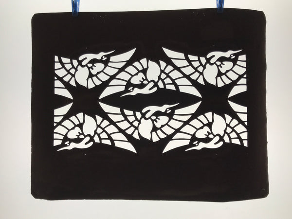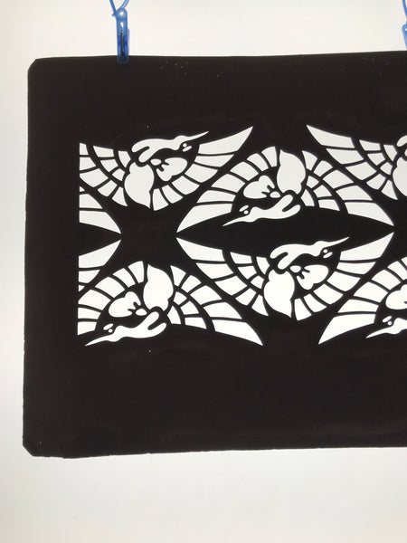 This antique Katagami was designed during the mid or late Edo period (1860) to early Meiji (1900) in Central Japan. It is made of two or more layers of handmade mulberry paper laminated together and waterproofed with persimmon tannin. Katagami printing uses a technique called resist dye where a paste is applied to the fabric with the katagami before dipping in ink. The open space on the katagami will be a negative space in the printed design.