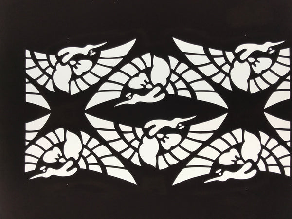 Using traditional mulberry paper, this katagami stencil with no silk mesh backing features a design with large depictions of cranes (tsuru).