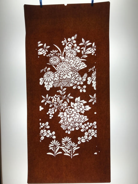 This antique Katagami was designed during the mid or late Edo period (1860) to early Meiji (1900) in Central Japan. It is made of two or more layers of handmade mulberry paper laminated together and waterproofed with persimmon tannin. Katagami printing uses a technique called resist dye where a paste is applied to the fabric with the katagami before dipping in ink. The open space on the katagami will be a negative space in the printed design.