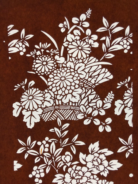 Using traditional mulberry paper, this katagami stencil with silk mesh backing features a busy design of large chrysanthemums and peonies.