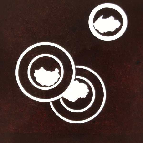Using traditional mulberry paper, this katagami stencil with silk mesh backing features a simple circular pattern with what appears to be small flowers inside. It could be a mon or kamon symbol, however this is one piece of a multi-layer complex katagami set. Unfortunately, many of the pieces are separated or lost over time.