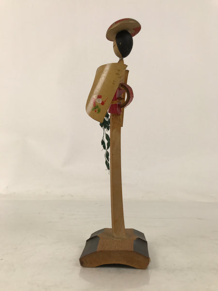 This vintage Japanese bamboo kokeshi figurine represents a woman dressed in a kimono with a red obi, and wearing a gold an red round hat. The woman is holding spikes of rice in one hand. It is attached to a stand. The body of the doll and the stand are bamboo, and the head and the hat are wood.