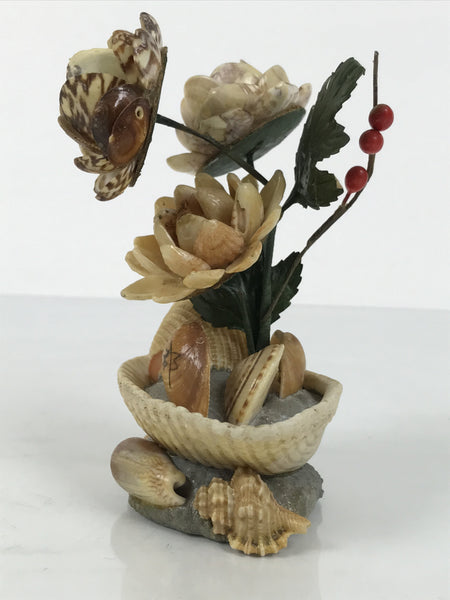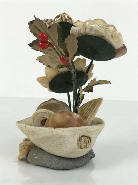 This vintage Japanese shell kokeshi figurine represents flowers in a pot. It is made from some types of clams for the petals, wires wrapped in green paper for the stems, and a larger clam for a pot. Other clams and shells are added as decoration. One clam has an inscription of a place name.