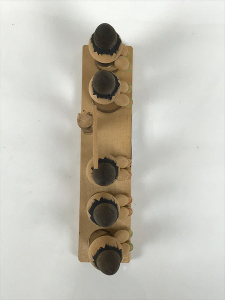 This is a vintage Japanese wooden doll figurine from the Hirugano Kogen plateau. Five child figurines are arranged in a row with a sign on a wooden base. They have a round head with a painted smiling expression, a slightly round, cylindrical body, and chubby feet with painted Zori sandals. There is a sticker on the front of the base.