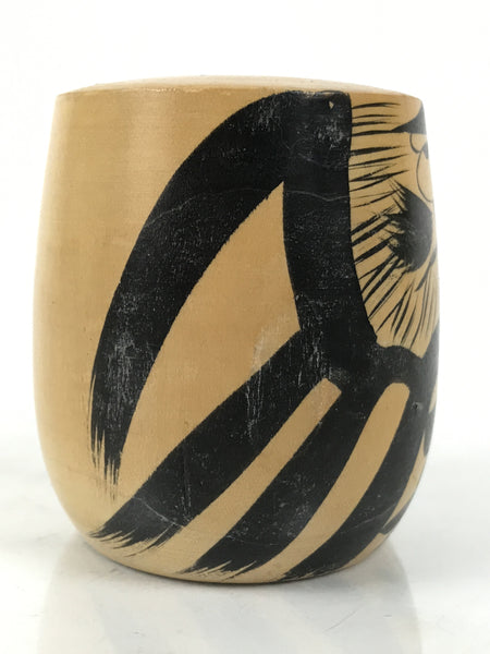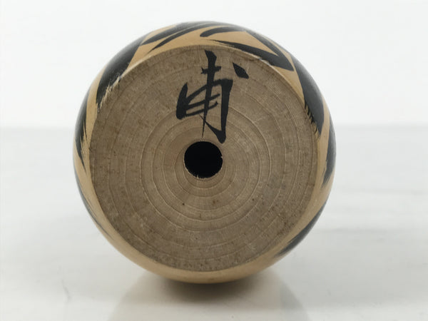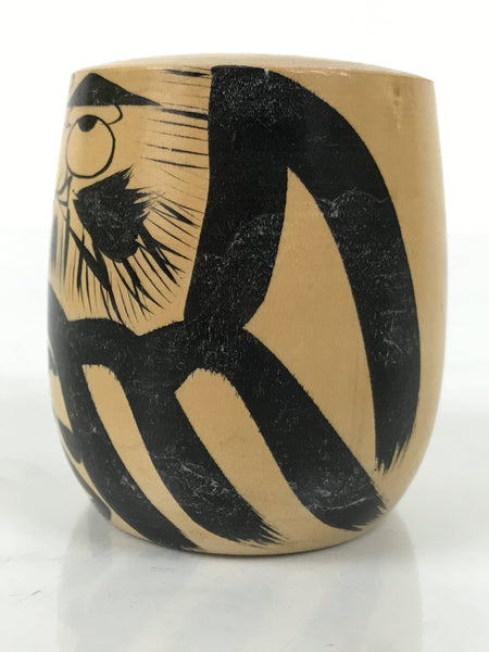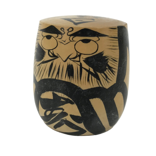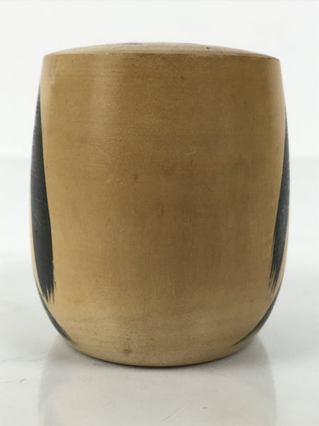 This is a vintage Japanese wooden Daruma figurine. It is cut out from a piece of wood, with slightly rounded sides and top, and a flat bottom. It features a black-painted Daruma face and Kanji characters on the top and bottom.