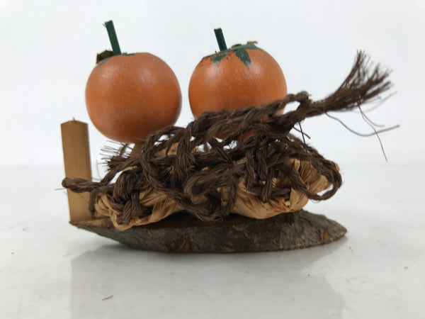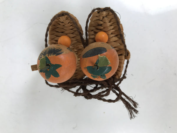 This is a vintage Japanese traditional craft wooden kokeshi doll figurine. It represents a pair of kids with an orange motif. From the front, it appears that two kids are sitting on a pair of straw sandals, Waraji, and from the back, it looks like two oranges are on the Waraji. There is a sign next to the kids. The kids are fixed on a wood slice. This seems to be a souvenir of Tateyama, Chiba.