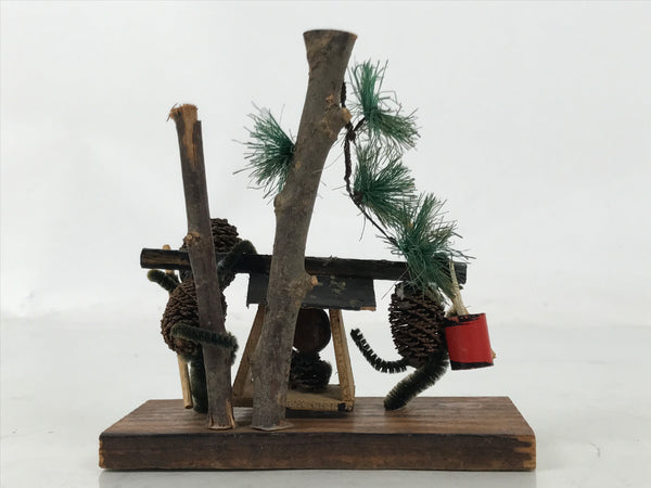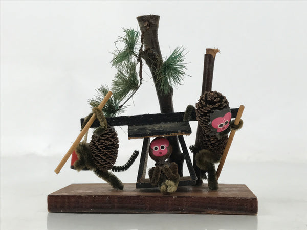 This vintage Japanese wooden kokeshi figurine features three monkeys made of pine cones. Two monkeys are carrying a litter, or palanquin, and the third monkey is sitting inside. There are trees on the back. Everything is attached to a wooden stand.