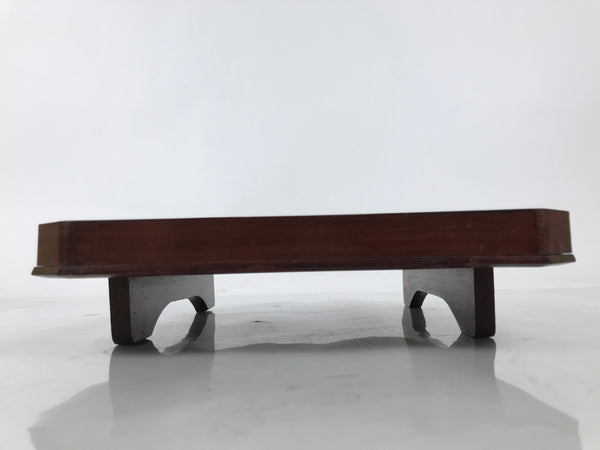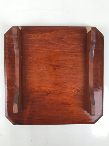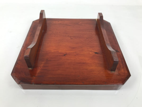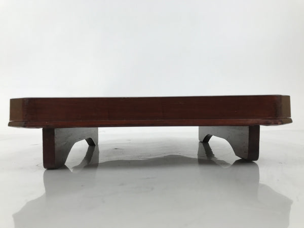 This is an antique Japanese lacquered wooden table or Ozen. This low square table has four cut corners, which is called sumikiri-zen, and two panel legs. It has open spaces that the legs slide on. This item can be used as a small table or a serving tray.