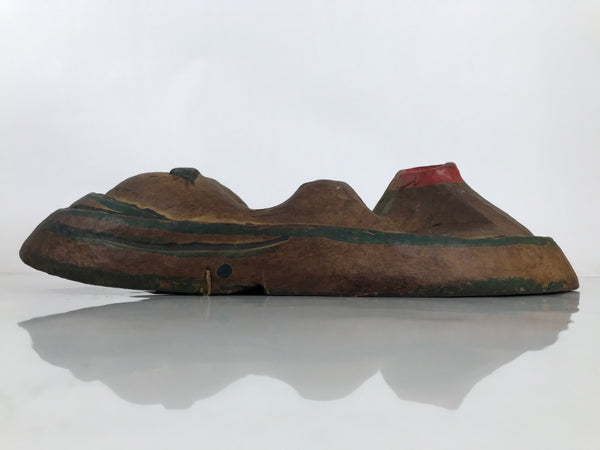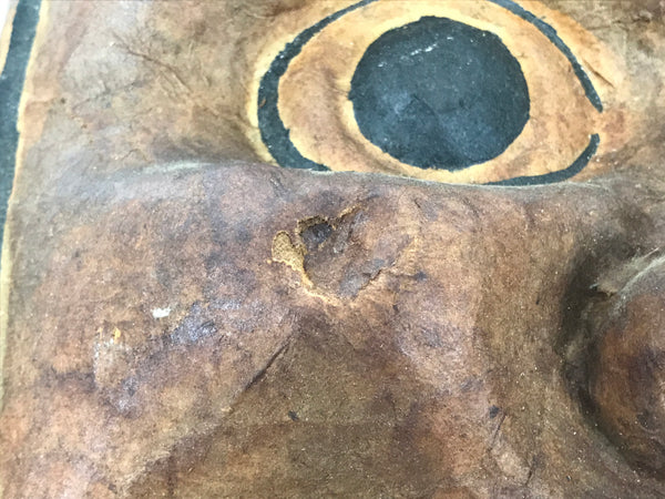 This is a large vintage Japanese paper mache noh mask (noh-men) for decoration. This character is the face of a man named Hyottoko. This character is a man with a twisted, puckered mouth off to one side and a scarf tied around his head. He is said to be a comical character and often paired with Okame which is the female equivalent. In many performances, Hyottoko plays the role of a clown.