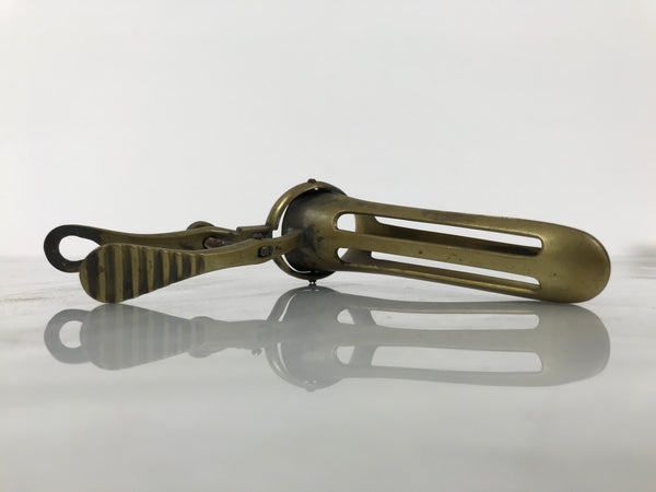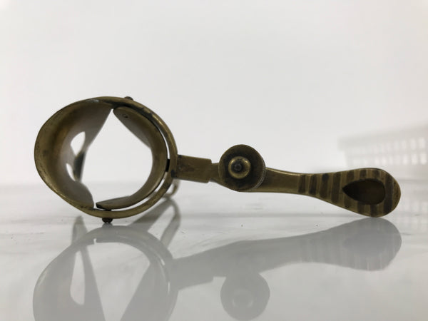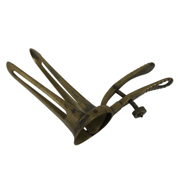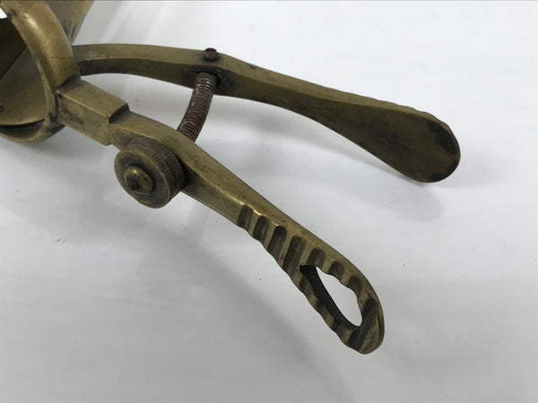This is an antique Japanese brass metal vaginal speculum used during gynecological exams. It has the typical duckbill shape with open slots. There is a curved bolt between the handles with a nut to secure the device in an open position.
