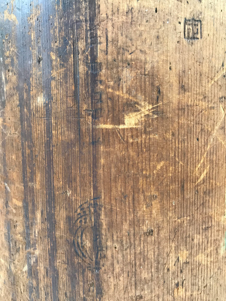 • Good condition considering its age. Scratches, dents, marks and discoloration. Some insect damage on inside base and around handles. Iron bands have some rust. Wear and tear due to age. Please see the photos.