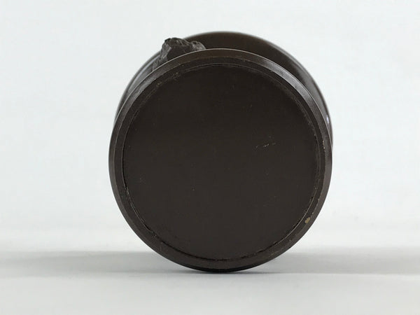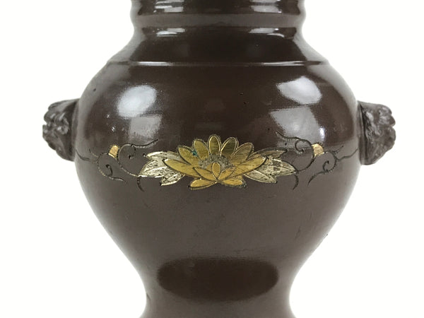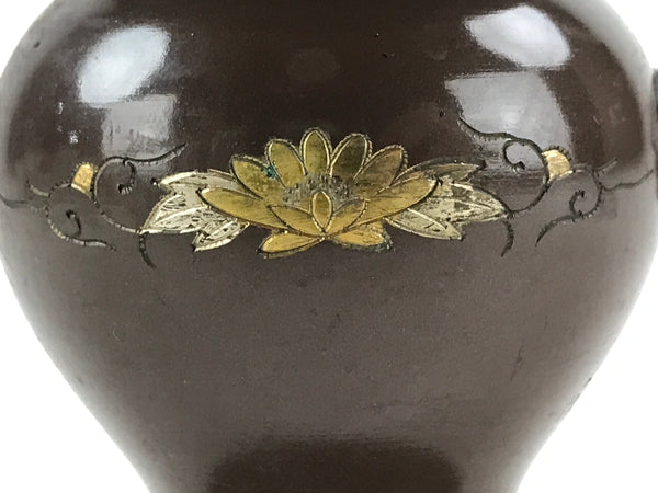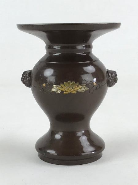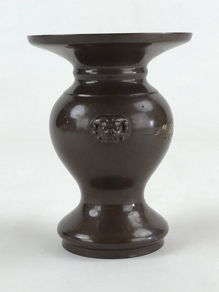 This item is a vintage metal flower vase for Buddhist altars. It is brown and decorated with a gold engraved floral design. It has two small handles on the sides. It is a single-flower vase for Sakaki leaves or Shashagi leaves. The meaning of offering sakaki tree leaves is that we believe the gods' living sakaki tree will protect the grave and the soul.