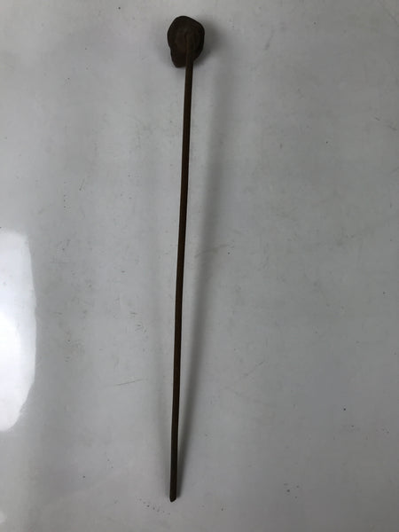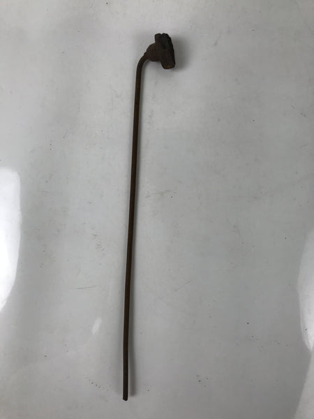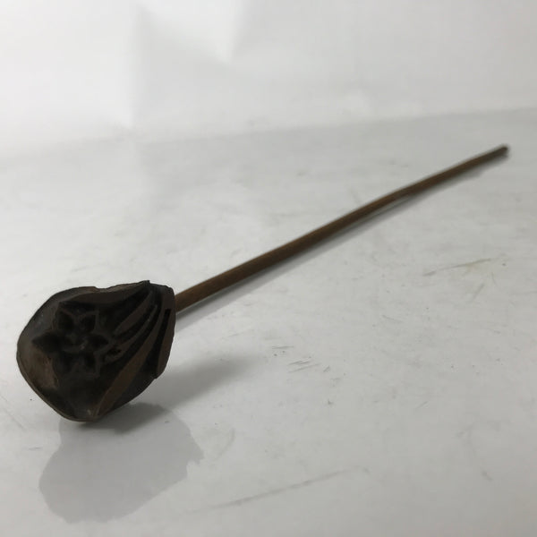 This is a vintage cast iron branding stamp called yaki-in. This piece is meant to be placed over fire or coals and is used to mark wood, leather, fabrics, and most famously traditional Japanese sweets and snacks such as manju, dorayaki, senbei, etc. It features the image of a daffodil (suisen) with leaves.