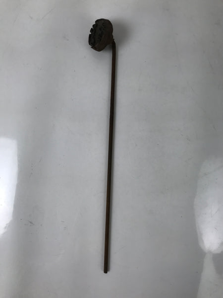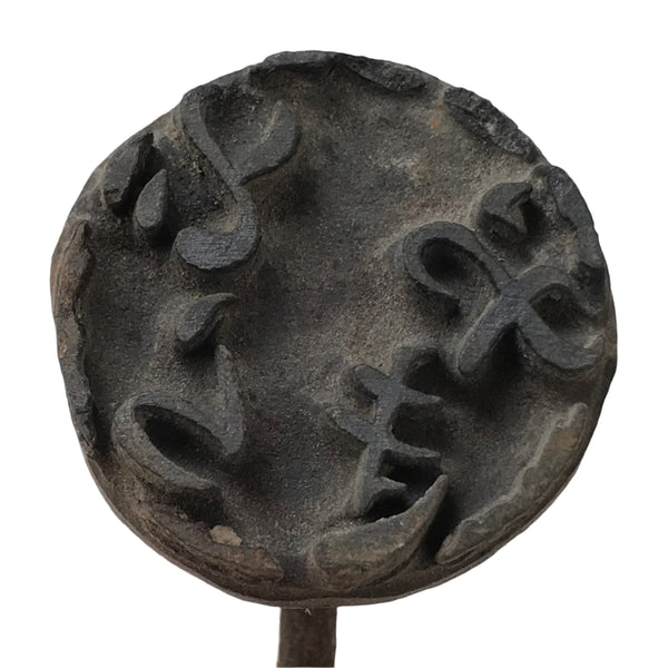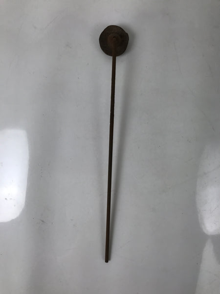 This is a vintage cast iron branding stamp called yaki-in. This piece is meant to be placed over fire or coals and is used to mark wood, leather, fabrics, and most famously traditional Japanese sweets and snacks such as manju, dorayaki, senbei, etc. It features a simple round shape with Japanese hiragana characters. It says dorayaki どらやき. Dorayaki are a traditional and well-loved Japanese sweet that is made of two sweet pancakes with anko red bean paste between them like a sandwich.