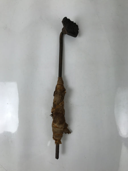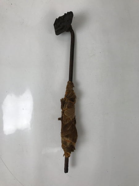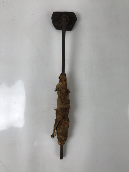 This is a vintage cast iron branding stamp called yaki-in. This piece is meant to be placed over fire or coals and is used to mark wood, leather, fabrics, and most famously traditional Japanese sweets and snacks such as manju, dorayaki, senbei, etc. It features a countryside mountain valley landscape complete with river and bridge. There are Japanese kanji and kana characters, but the last kanji has worn away with time. It says "Hometown..." (furusato no... ふる里の...). It has old cloth wrapped around the handle to prevent burns during use.