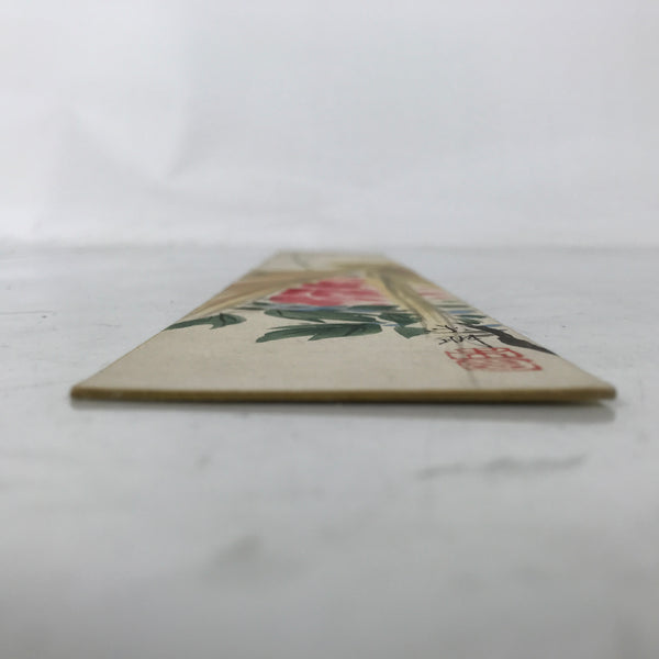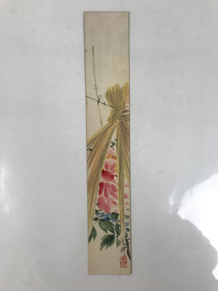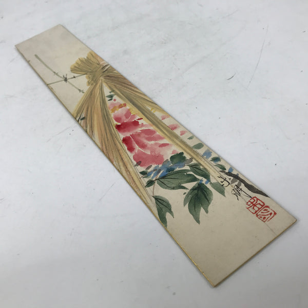 This vintage Japanese tanzaku long-type shikishi art board features peony flowers covered with a straw hut. These straw huts, called warabocchi in Japanese, are built to protect the plant from the snow. The shikishi is hand-painted and has a sign and a red seal.