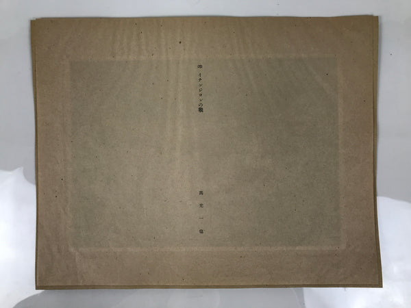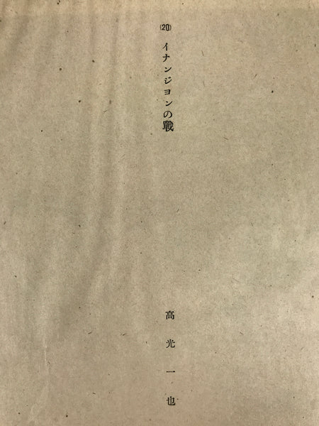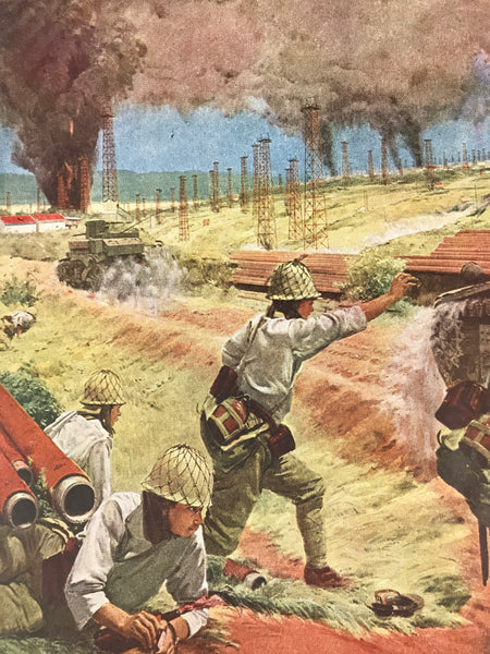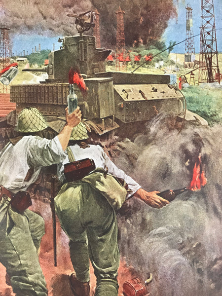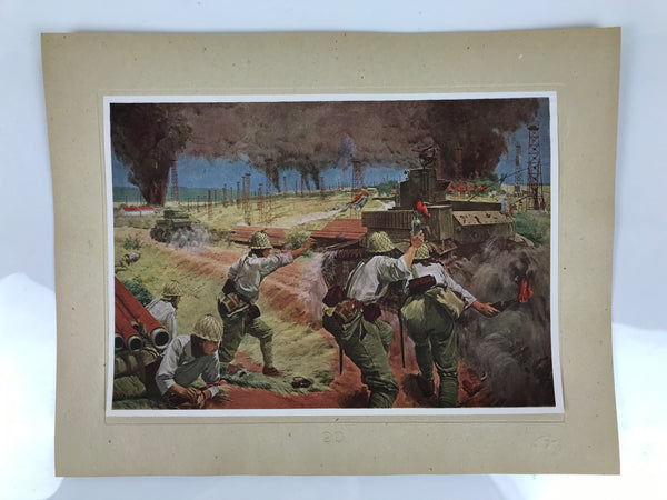 This is a vintage Japanese machine-printed reproduction of military art by Kazuya Nakamitsu. The piece is called 'Battle of Yenangyaung' (1942). The piece is placed on a piece of cardboard with a protective sheet of paper on top, with explanations in Japanese.