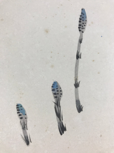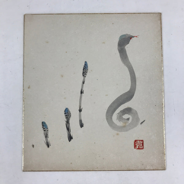 This item is a vintage hand-painted shikishi art board showing the reproductive stems of horsetails and a snake standing. It has beautiful blue, green and red color accents. This shikishi art board is a timeless display piece that can find a place in any home or office decor.