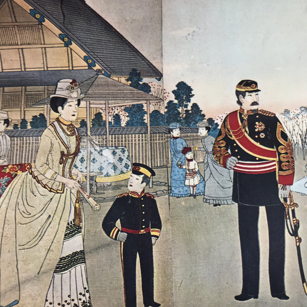 This Japanese art print is a reproduction of ukiyo-e woodblock print by Inoue Yasuji called 'Imperial Family at Yasukuni Shinto Shrine' (1888). It features the family of the Meiji Emperor, in uniform and Western dresses, standing in the courtyard of the shrine. There is a waterfall on the right, and Yasukuni Shrine is in the background on the left.