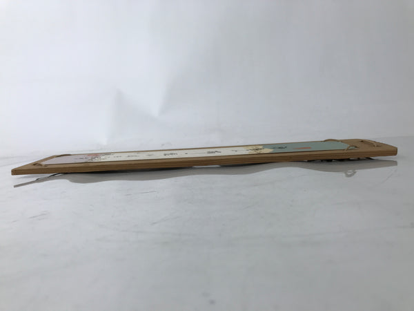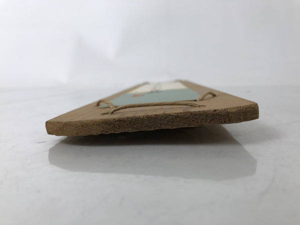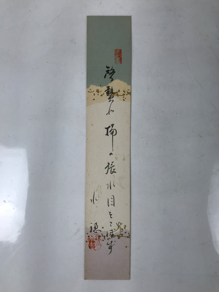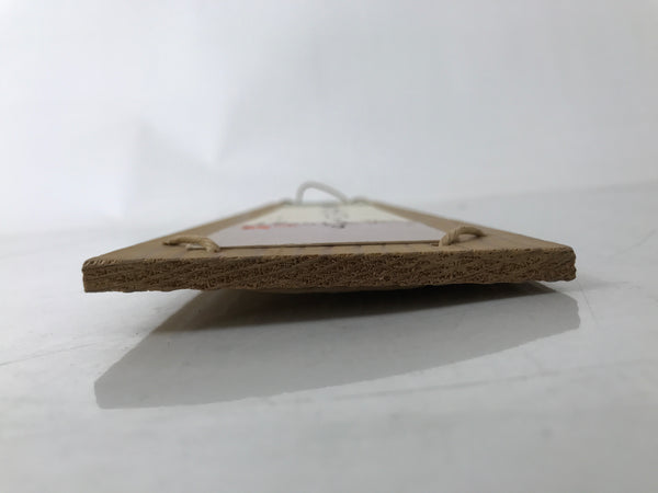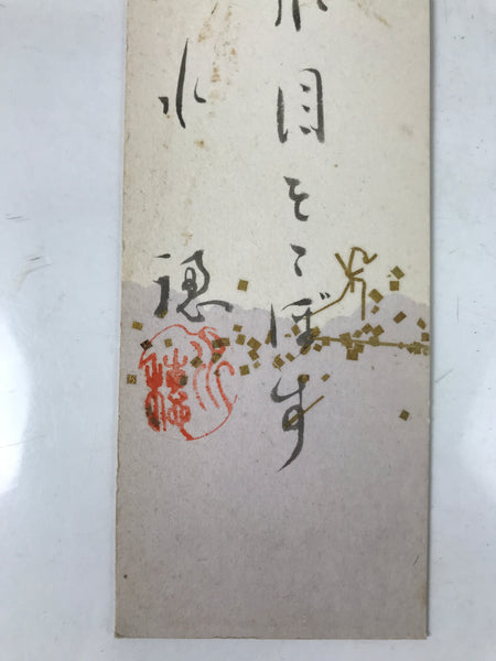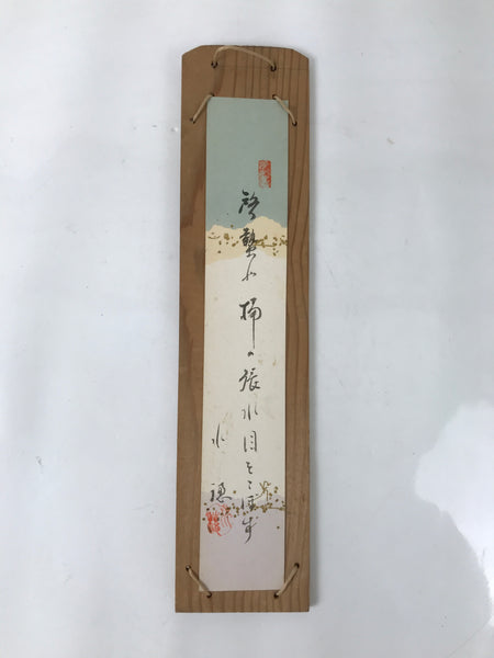 This is a vintage Japanese wooden wall hanging frame, Tanzaku-kake, with a Tanzaku. A Tanzaku is a long and narrow Shikishi used for painting and writing Japanese poems such as Haiku or Tanka. The Tanzaku is designed with pale colors and gold dos. A hand-written Japanese poem, Haiku, is on it. The frame is textured on the back. Strings are used for fixing a Tanzaku.