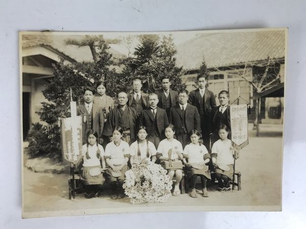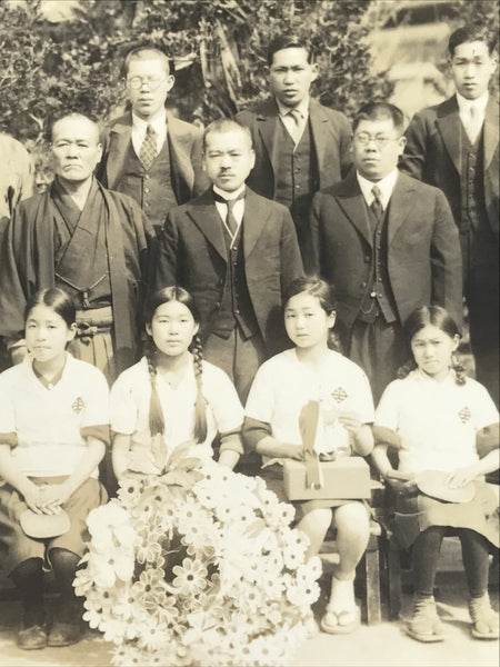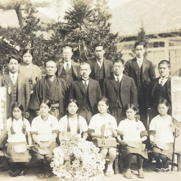 This is an original vintage early Showa Era sepia tone photograph of a school girls' table tennis team victory photo. The girls wear their sports uniforms and sit in front of their teachers and school admin staff (principal, vice principal, etc).