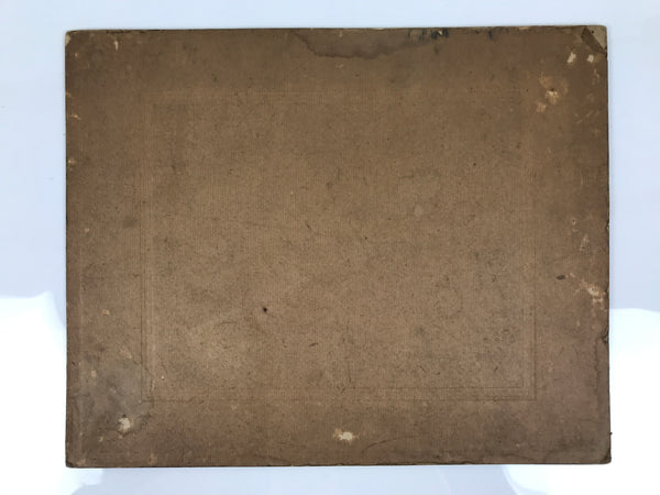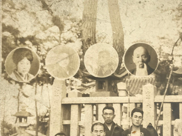 This is an original vintage Showa Era sepia-toned photograph of a group of people posing at a shrine (located in Toyama prefecture) in front of a stone monument. The people are mostly men wearing hakama, a type of kimono. Shinto priests and girls are also posing. The photograph is pasted on a sturdy and thick piece of cardboard.