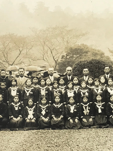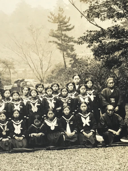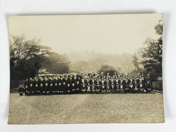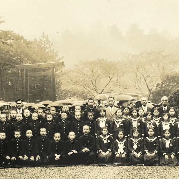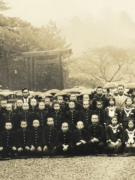 This is an original vintage Showa era photograph of a class of students in a soft sepia tone. The girls wear sailor fuku uniforms, while the boys also wear traditional uniforms. The teachers all wear suits with the exception of the two elderly women on the right side. They are posed in front of the first torii gate and bridge of Ise Grand Shrine in Mie Prefecture.