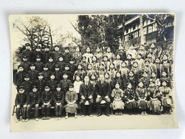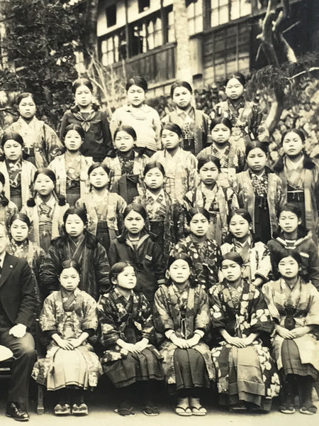 This is an original vintage early Showa era photograph of a school class of students in a soft sepia tone. The girls wear a combination of beautiful hakama with haori and sailor fuku uniforms, while the boys wear traditional uniforms with caps. The front row male staff are dressed in suits.