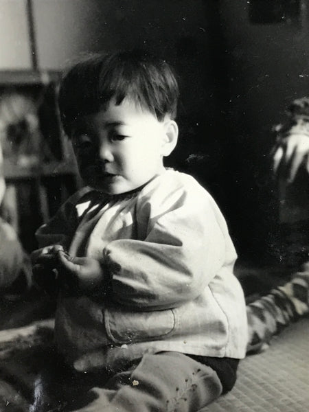This is an original vintage Showa-era black and white portrait photograph of a young boy (maybe a year old) sitting on a tatami mat floor. He is wearing a pinafore common for babies and toddlers to keep their clothes free from dirt and messes.