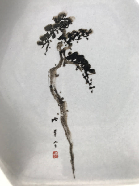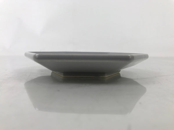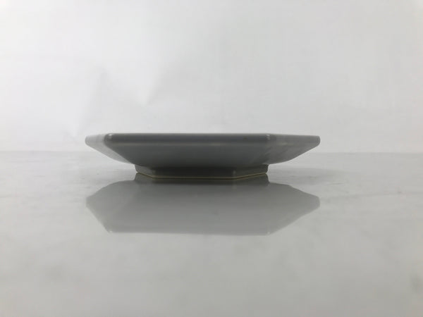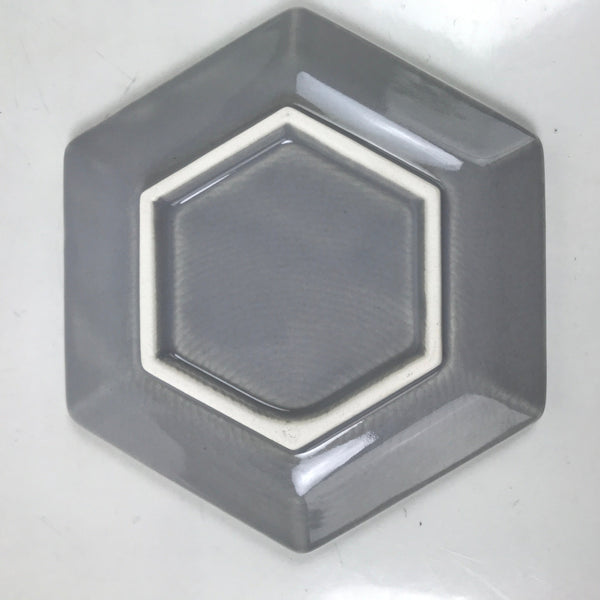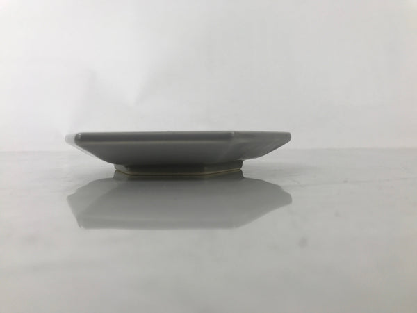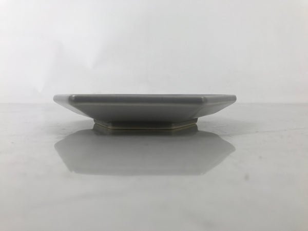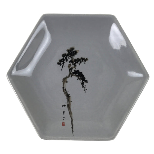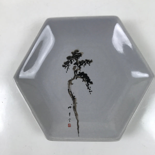 This vintage Japanese small hexagonal plate is made of porcelain and has a smooth gray glaze. The overall design features a black printed pine tree. This type of plate is called meimeizara and is the perfect size to serve wagashi, traditional Japanese sweets. It also serves as a plate for side dishes in a Japanese meal set.
