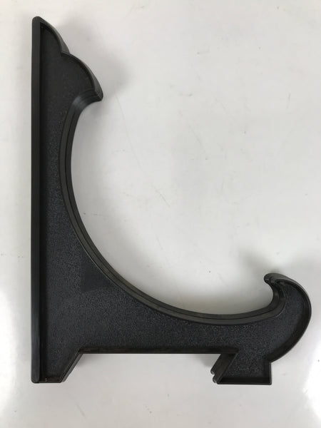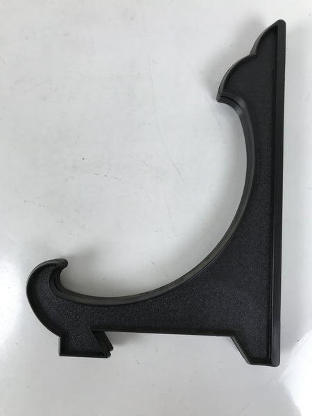 This is a vintage Japanese decorative porcelain plate. This large round plate (ozara) is blue, white, and orange with a detailed image of gray carp and orange and white koi swimming in water between pine trees and full-bloom chrysanthemums. The border is simply brown. This plate comes with a black resin stand and the original paper box.