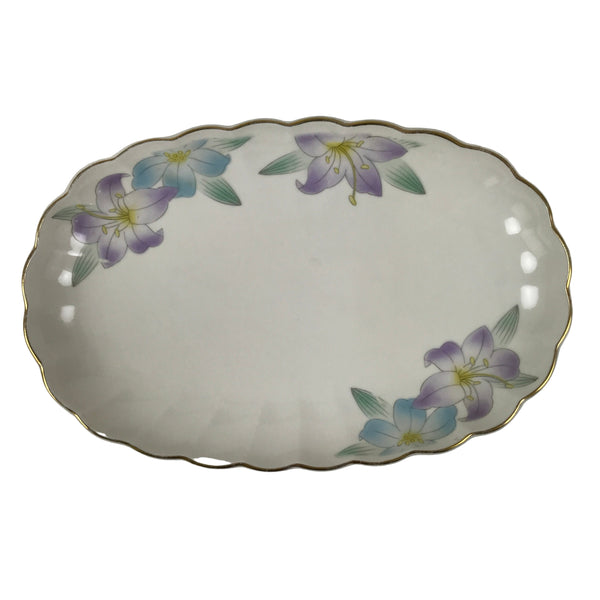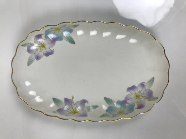 This is a vintage Japanese porcelain serving plate. It is white and has a design of purple and blue lilies, and a gold line on the rim. The shape is oval with a raised side, and the rim is wavy like the petals of a chrysanthemum, which is called kikuzara. It is great for serving side dishes, desserts, and other light dishes.