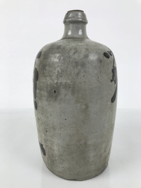 This is an antique Japanese ceramic sake bottle. It is called a Kayoi-Tokkuri and is used to pour sake. The commuting sake bottle became popular as a rental container for liquor stores in the Edo period when sake began to be consumed daily. This gray bottle has brown lettering and a cork on the top.