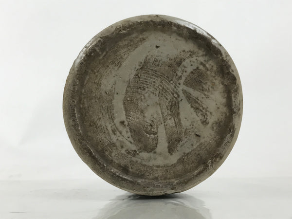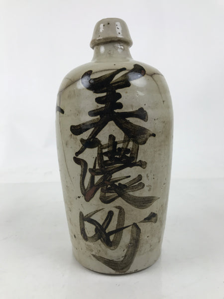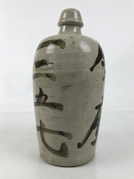 This is a vintage Japanese ceramic sake bottle. It is called a Kayoi-Tokkuri and is used to pour sake. The commuting sake bottle became popular as a rental container for liquor stores in the Edo period when sake began to be consumed on a daily basis. This bottle is gray and has black characters on the front and on the back.