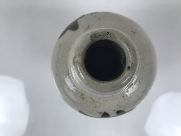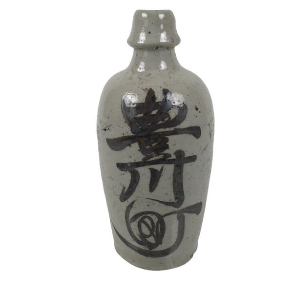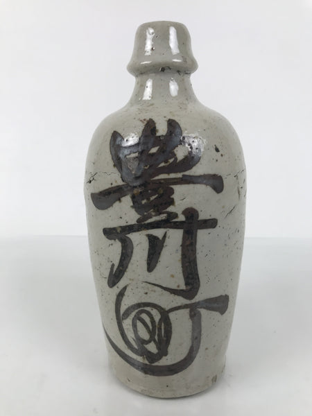 This is a vintage Japanese ceramic sake bottle. It is called a Kayoi-Tokkuri and is used to pour sake. The commuting sake bottle became popular as a rental container for liquor stores in the Edo period when sake began to be consumed daily. This gray bottle has brown lettering.