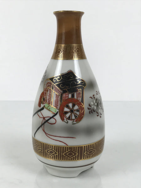 This is a Japanese vintage Kutani porcelain sake bottle or Tokkuri. This beautiful imari sake bottle is fully decorated with hand-painted, intricate gold linework and floral accents. The entire design features a decorated court carriage ox cart, also called gosho guruma. It has the Kutani marking on the bottom.