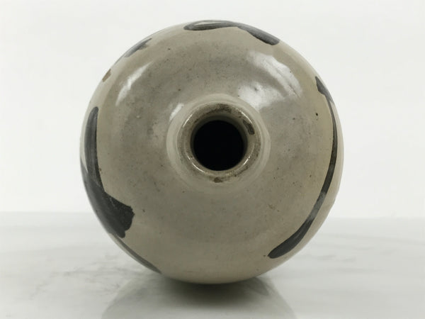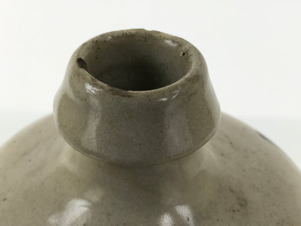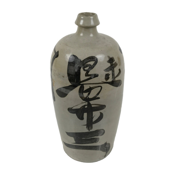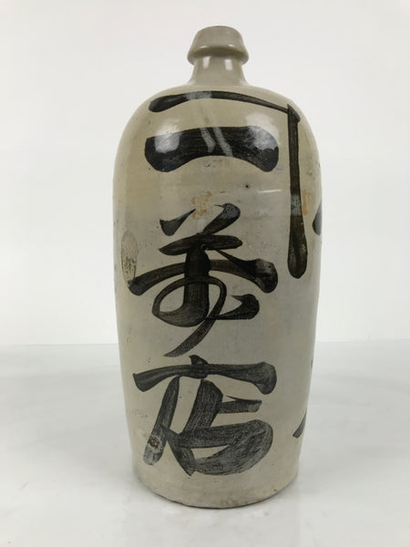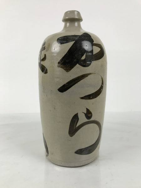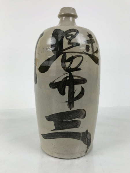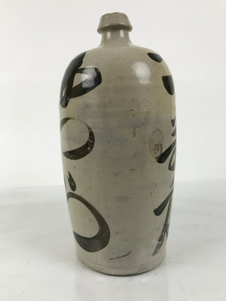 This is an antique Japanese ceramic sake bottle. It is called a Kayoi-Tokkuri and is used to pour sake. The commuting sake bottle became popular as a rental container for liquor stores in the Edo period when sake began to be consumed daily. This gray bottle has black characters.