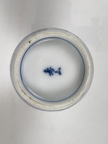 This is a Japanese vintage porcelain sake bottle or Tokkuri. This beautiful sake bottle is mostly white with a seaside islands connected by bridges design in blue. It is a compact size with a generous volume (roughly ichi-go), making it easy to use daily for beverages or as a small flower vase.