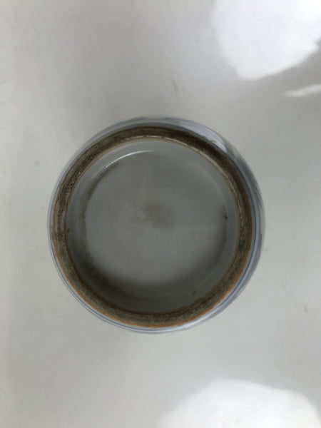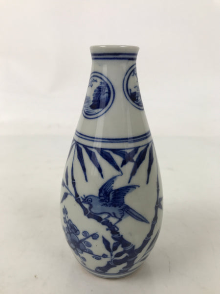 This is a Japanese vintage porcelain sake bottle, or Tokkuri. It is white and blue in a sometsuke design that features a shochikubai motif (pine trees, plum blossoms, and bamboo) as well as a birds and small circles with seaside scenery. Its compact size makes it easy to use daily for beverages or as a small flower vase.