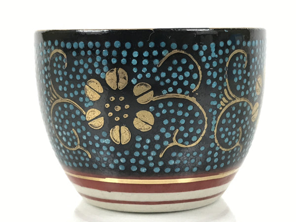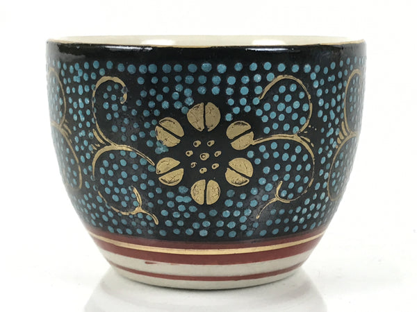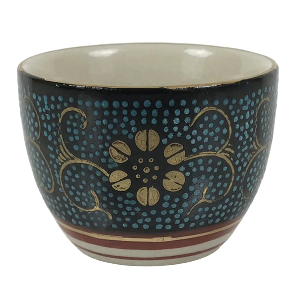This is a vintage Japanese Kutani porcelain sake cup. This particular type of cup is called tsubomi or "bud type" due to its resemblance to a flower bud. In terms of size, it is also called ochoko. This beautiful imari sake cup is fully decorated with precise gold linework of flowers and vines on a raised-texture blue dotted background. There is a red and gold banded line near the base for one extra touch of color. The inside is solid white. It has the Kutani marking on the bottom.