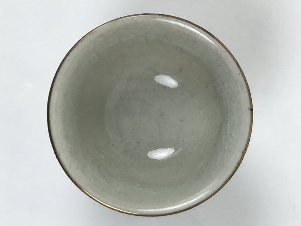 This is a vintage Japanese Kutani porcelain sake cup. This particular type of cup is called wan or "bowl type" due to its resemblance to a rice bowl. In terms of size, it is also called ochoko. This beautiful imari sake cup is fully decorated with precise gold linework surrounding a shochikubai (Pine, plum blossom, bamboo) motif on a raised-texture blue dotted background. Each scene is beautifully illustrated with green, gold, and red. The inside is a grayish-beige. It has a red Kutani marking on the bottom.