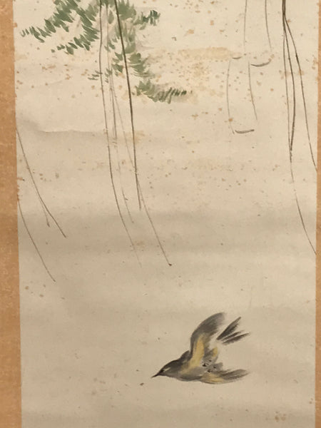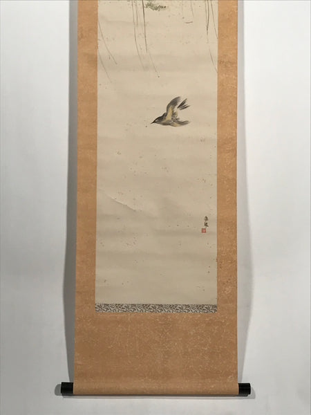 This antique Japanese hanging scroll (kakejiku or makimono) represents a flying bird with a rope, some green leaves from a plant, and a black, red and white flower. This type of kakejiku is called kacho, meaning bird and flower. This piece is signed with a name and a red seal.