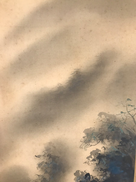 This vintage Japanese hanging scroll (kakejiku or makimono) features a waterfall and trees in the foreground, and a mountain in the fog in the background. This type of kakejiku is called sansui, literally mountains and water. It is painted with black ink and has colored details. This piece is signed and has a red seal.