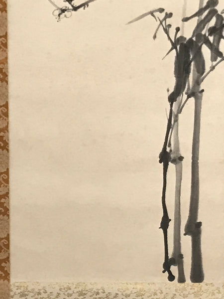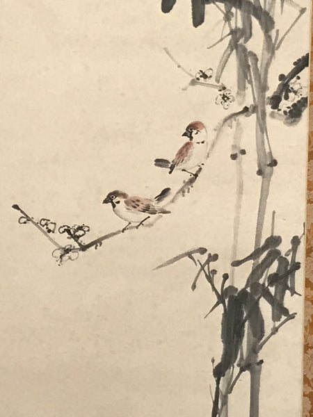 This vintage Japanese hanging scroll (kakejiku or makimono) features two brown and black little birds sitting on the branch of a plum tree bearing blossoms. Vertical black bamboos are painted on the right, and a poem is written vertically on the left. The piece is signed with a name and a red seal.