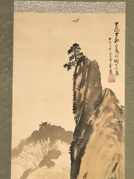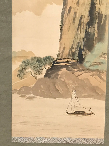 This vintage Japanese hanging scroll (kakejiku or makimono) features a colored landscape with a high cliff and a river with a boat in the foreground. In the background are mountains with the top of a temple pagoda. This piece is titled and signed with a name and a red seal.