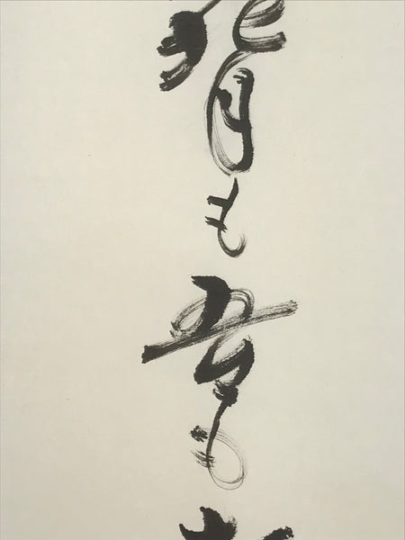This vintage Japanese hanging scroll (kakejiku or makimono) features calligraphy of a poem, likely a haiku poem. The base of the scroll is green. This piece is signed with red seals.